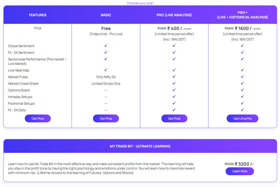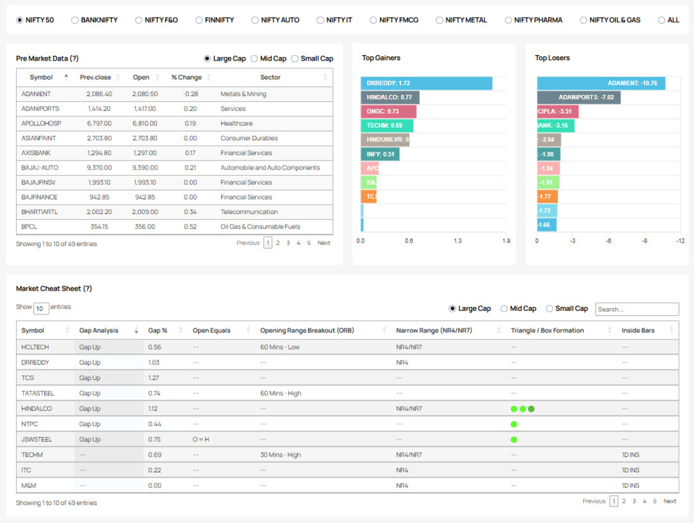 Dashboard enables you to start your day with the broader understanding of the Global and Domestic Markets, Sector performances in the pre market and the live market, FII/DII overview and other important market updates.Market Pulse helps you to take a quick decision in the ongoing markets with its gaining and losing momentum of stocks and the stats of the same.Index Analysis has the Options Board and the Futures Board which contains all the data you need to trade and analyze in the live market with the additional help of historical data that is segmented in smaller time frames as well.Stocks Buzz has the best intraday and positional setups to trade in the stocks with the highest probability that move in one directional momentum.FII - DII Data with the interpretation in cash, futures and options segment, will help you to know the bias of the market in upside or downside.5 Golden Rules For Wealth Creation